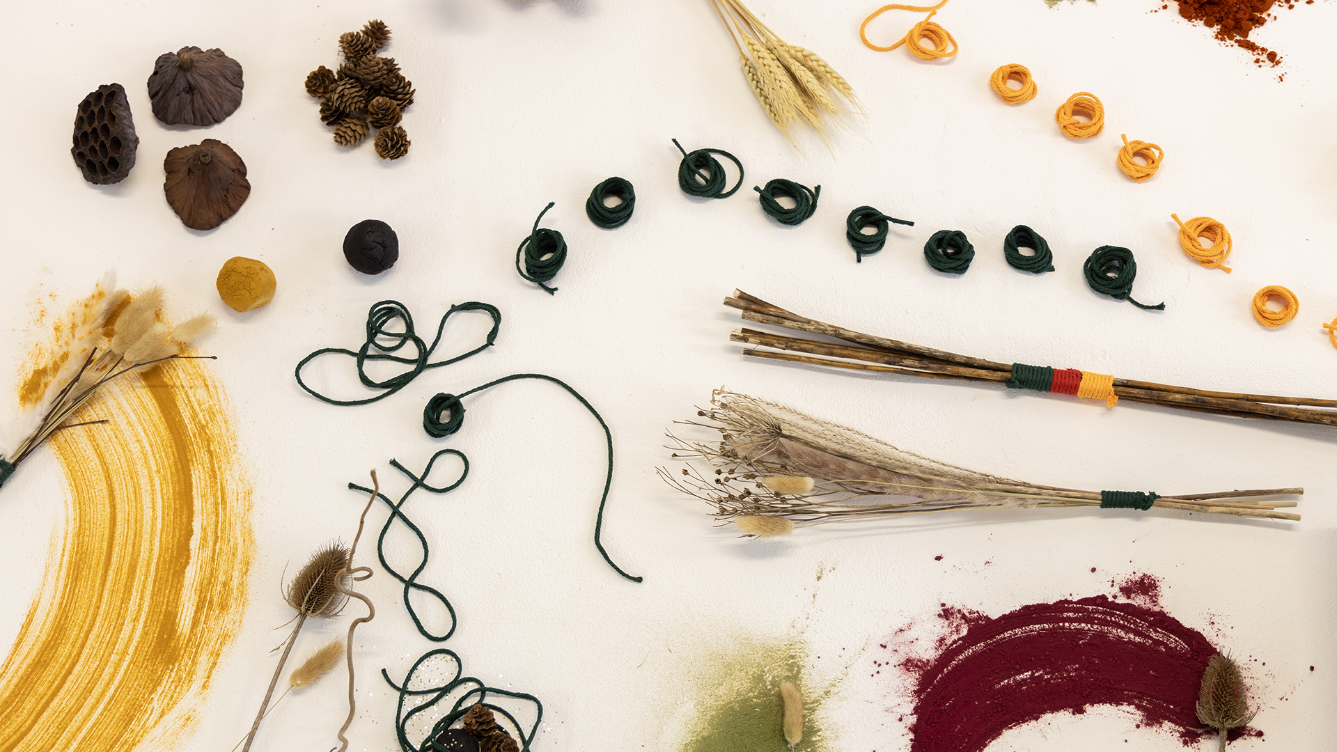 Sitting amongst eco tools, made of dried grasses and seed heads, are food pigment paints derived from turmeric, paprika, spinach and beetroot, interspersed with coiled twine - an entirely sustainable network of art materials.